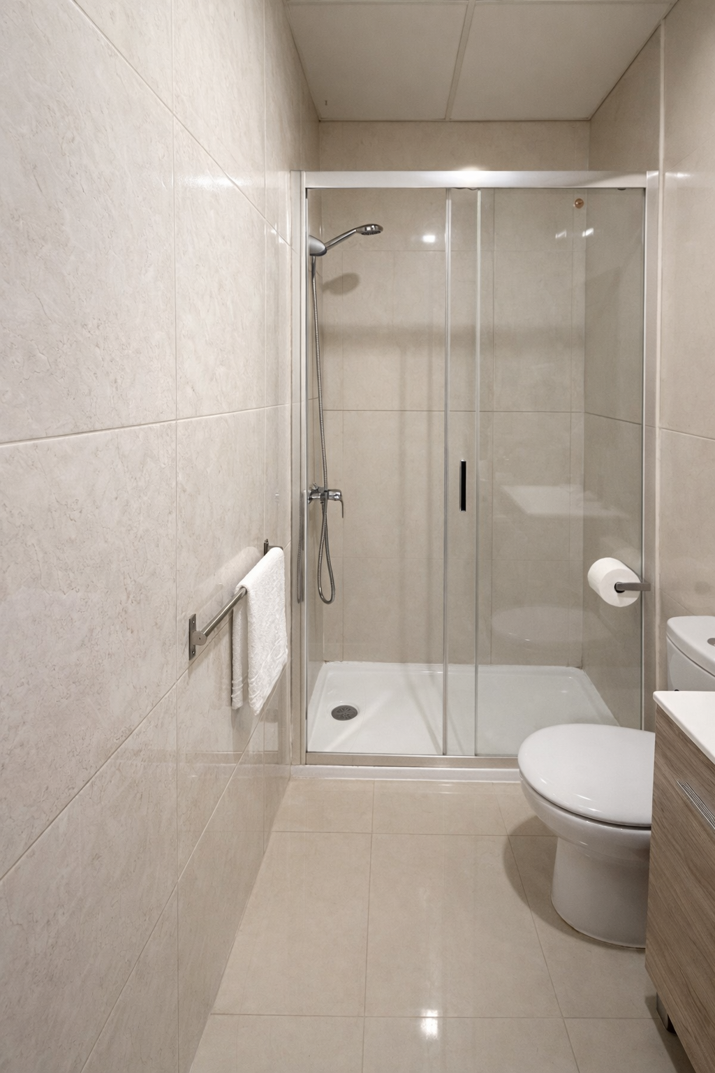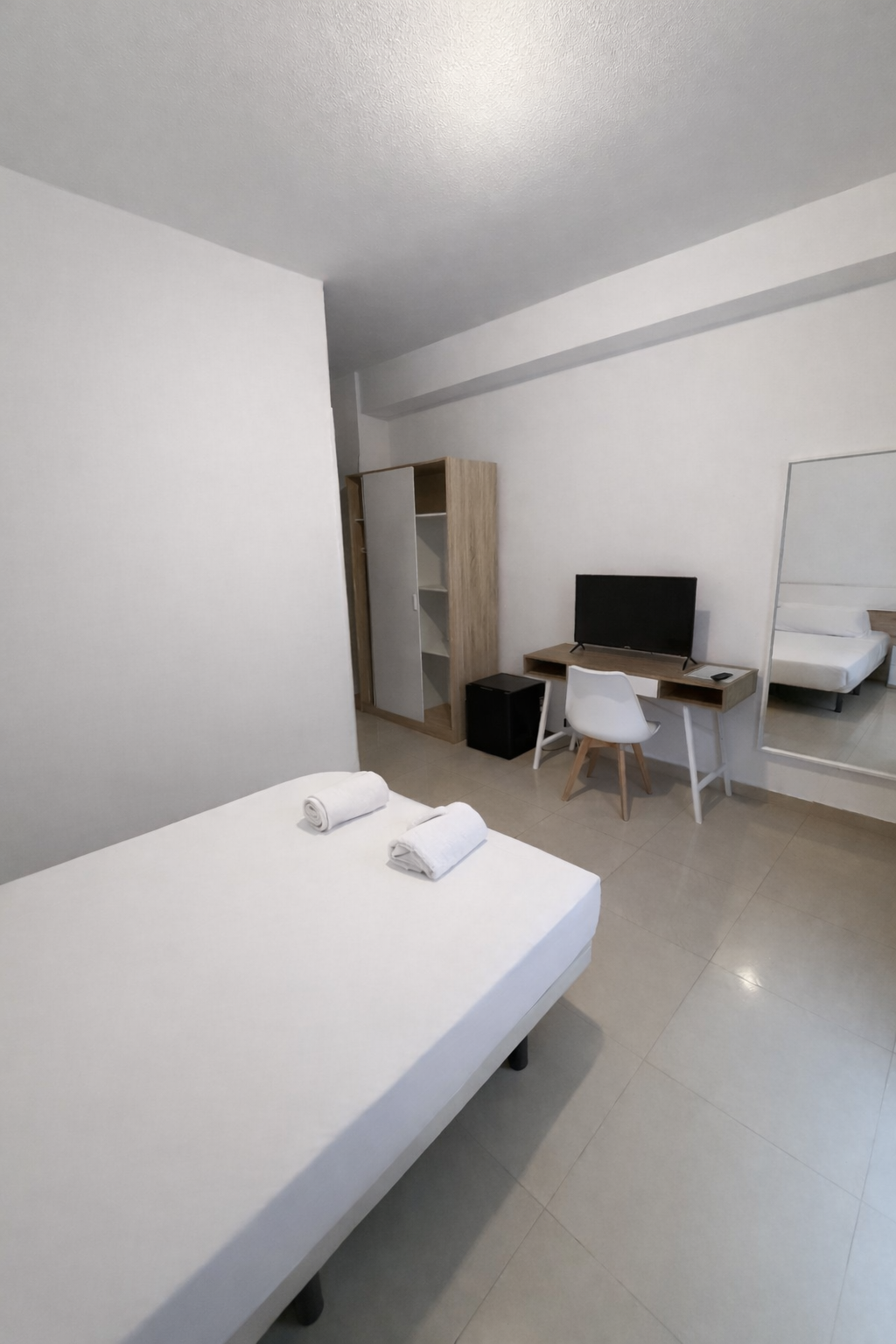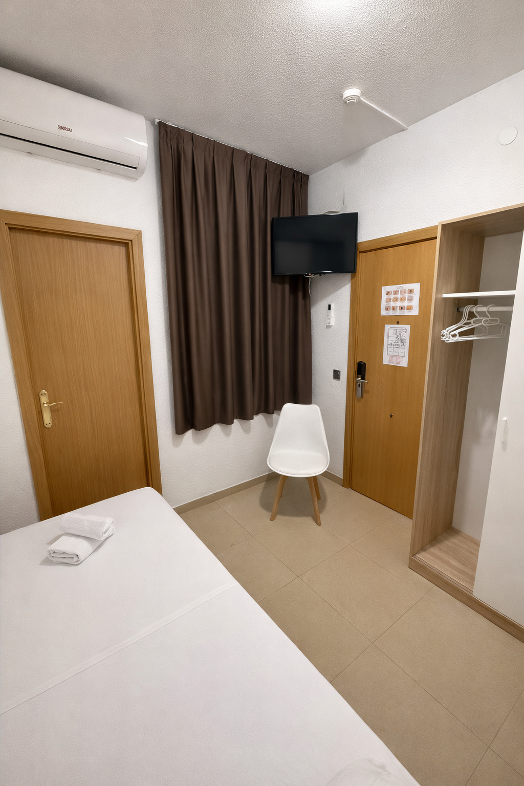 Single room with a single bed, hairdryer, free Wi-Fi, air conditioning, and TV. It features a wardrobe and a functional space for a comfortable stay. Includes a private bathroom with a bathtub, hairdryer, towels, and basic toiletries. Ideal for short stays or business trips.